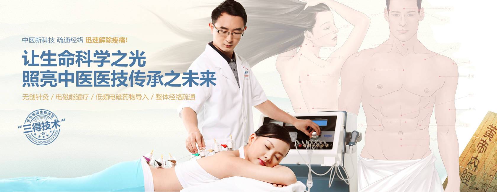 三得技術(shù)是一項基于低頻電磁能的全科高效臨床應(yīng)用新技術(shù),其四大首創(chuàng)技術(shù)分別是:“無創(chuàng)針灸”、“電磁能診療罐”、“彈道式電磁止痛沖擊槍”、“電磁能藥物導(dǎo)入”。